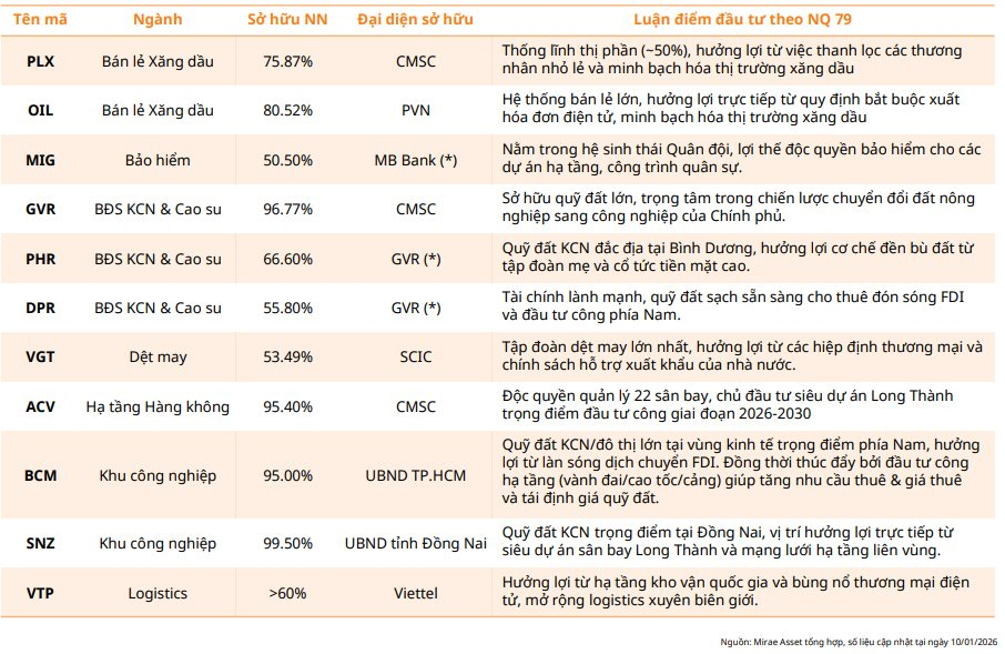 Danh mục doanh nghiệp niêm yết có vốn Nhà nước theo thống kê và chọn lọc của Mirae Asset, dù chưa đầy đủ do tính sở hữu chéo, tập trung vào các mắt xích mang tính chiến lược của nền kinh tế như năng lượng dầu khí, điện, ngân hàng, công nghệ, bất động sản khu công nghiệp, hạ tầng hàng không và logistics.